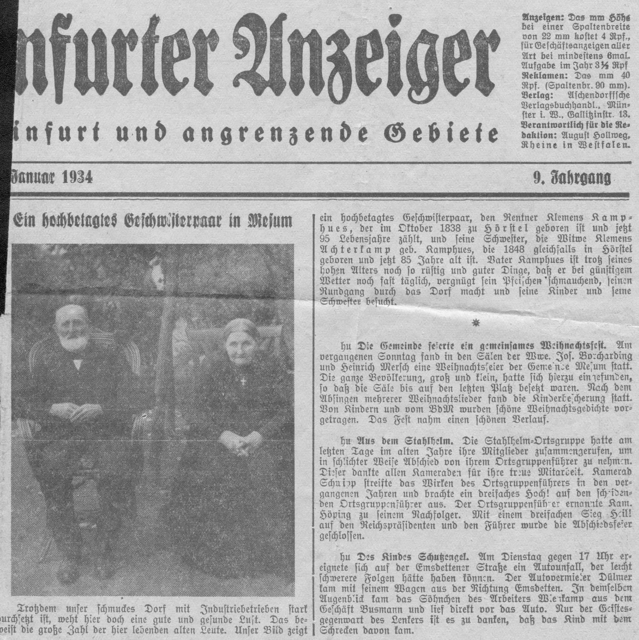 Bei der Durchsicht von einem alten Fotoalbum stieß ich auf einen Zeitungsausschnitt aus dem Jahr 1934, in dem über ein hochbetagtes Geschwisterpaar berichtet wird. Dieses (Halb-)Geschwisterpaar gehört zu meinen Vorfahren und zwar zu denen, über die ich relativ wenig weiß. Ein zweiter Zeitungsbericht über die Halbschwester Josefine Kamphues ist daher in der "Suche"-Abteilung untergebracht.